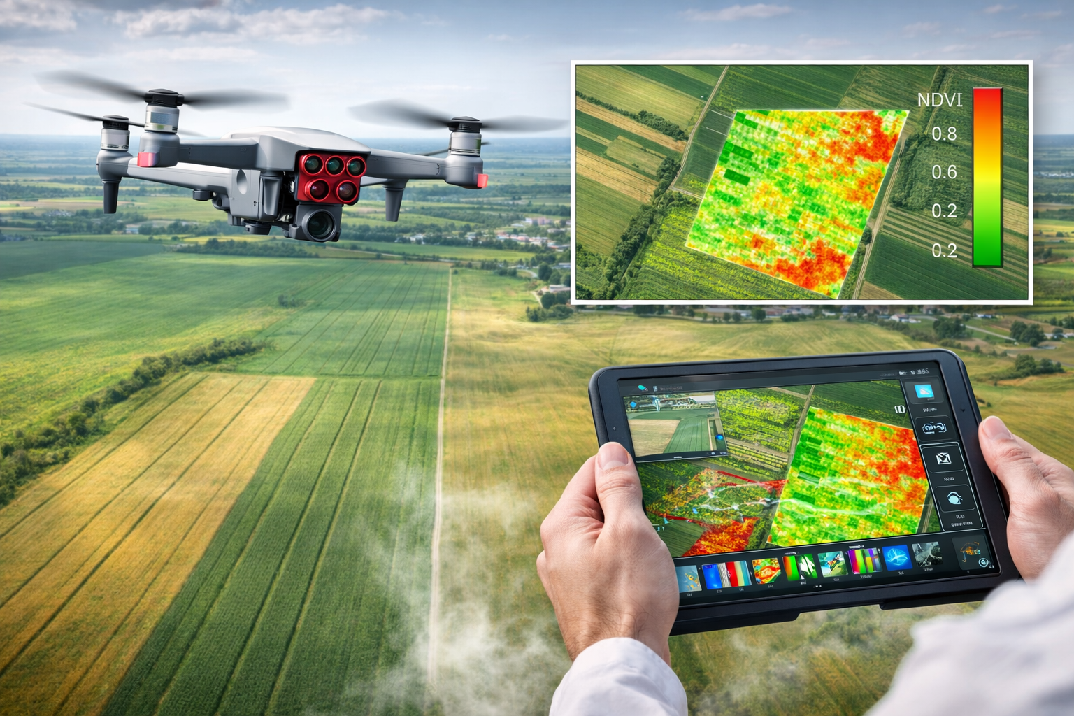 По карте NDVI агроном видит поле «тепловой картой»: проблемные зоны подсвечиваются красным, здоровые посевы — зелёным. Такая карта строится по снимкам с дрона с точностью до 3–5 см на пиксель, что позволяет локализовать даже небольшой очаг размером несколько квадратных метров.